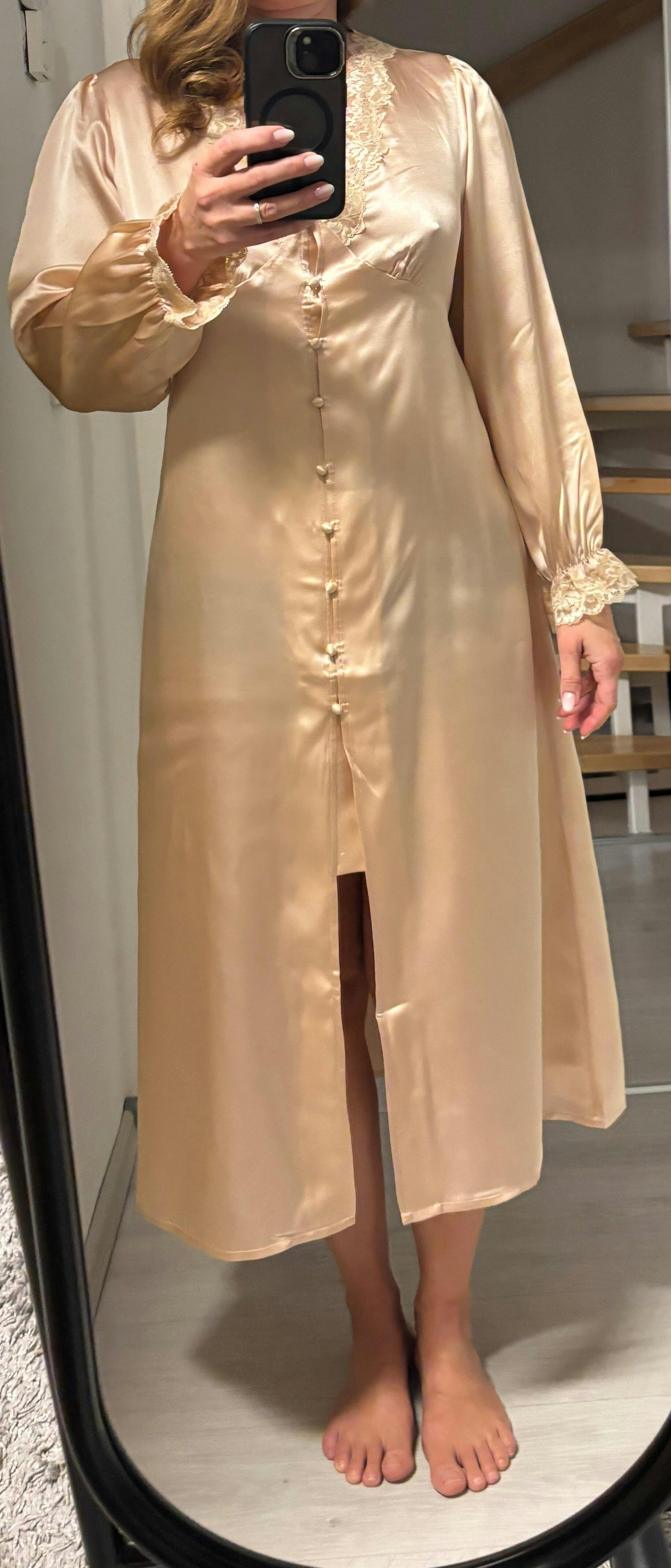 Das Nachthemd sieht wirklich elegant aus, perfekt geschnitten, ich bin begeistert. Ärgerlich für mich war lediglich, dass die Farbe falsch angegeben wurde. Es handelt sich um Altrosa und nicht Champagner Farbe. Ich habe mehrere Pyjamas und Nachhemden von hier gekauft, alle anderen haben dieselbe Farbe. Leider steht mir Altrosa nicht so gut,