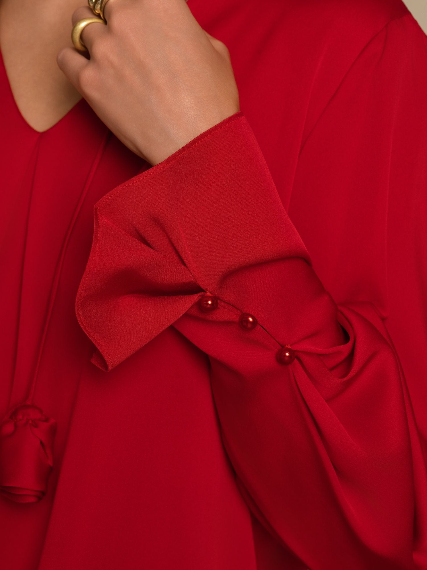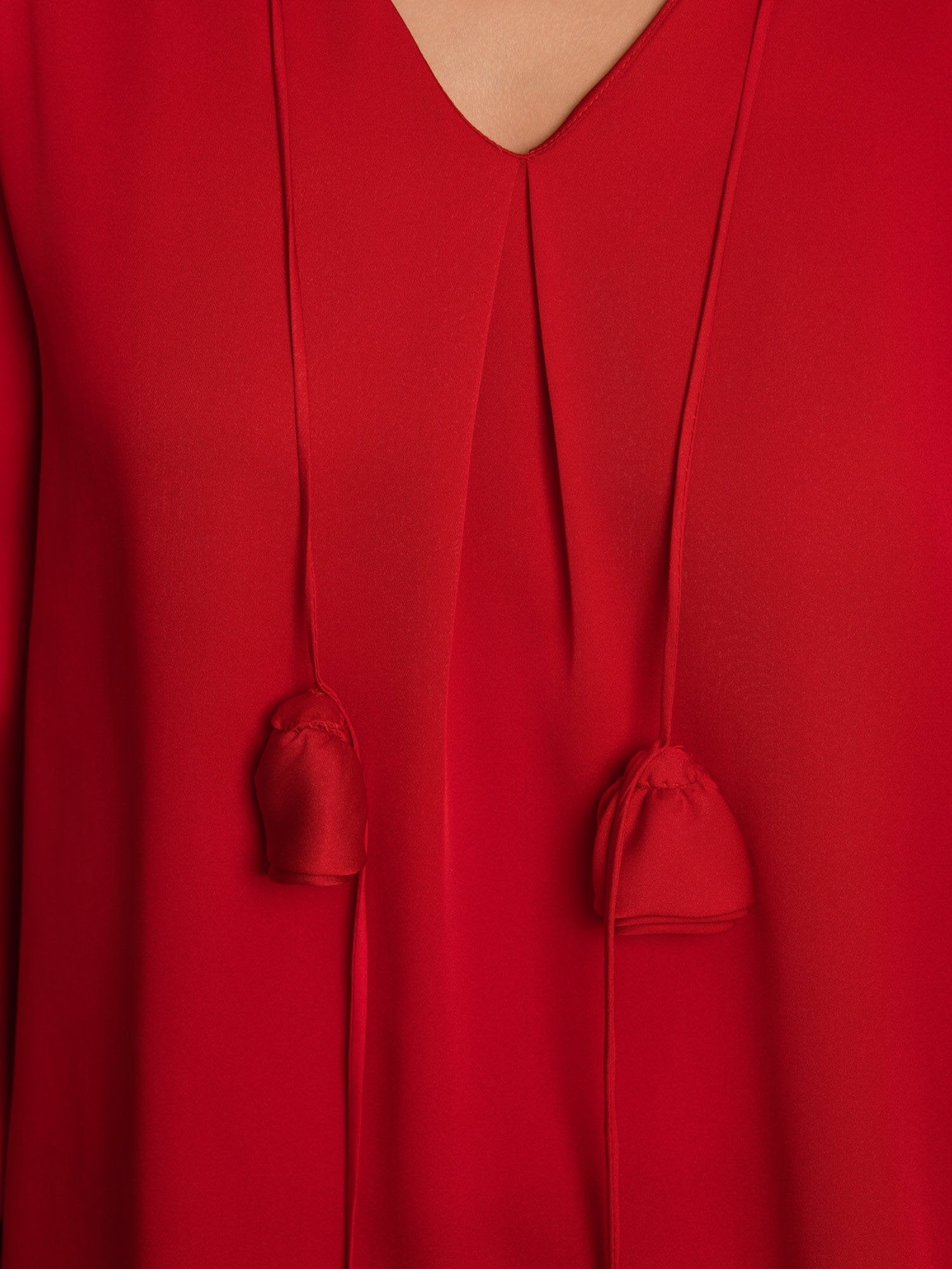 Crafted from a luxurious 19Momme stretch silk double georgette, this blouse offers a smooth, soft feel with a natural sheen. The V-neck and long sleeves create an elegant, timeless silhouette, while the pleated design adds texture and depth to the fabric. The buttoned cuff with subtle flare adds subtle sophistication, and the 3D rose embellishment enhances its feminine charm. Pair it with tailored trousers for a polished look or with a skirt for a chic, refined style.