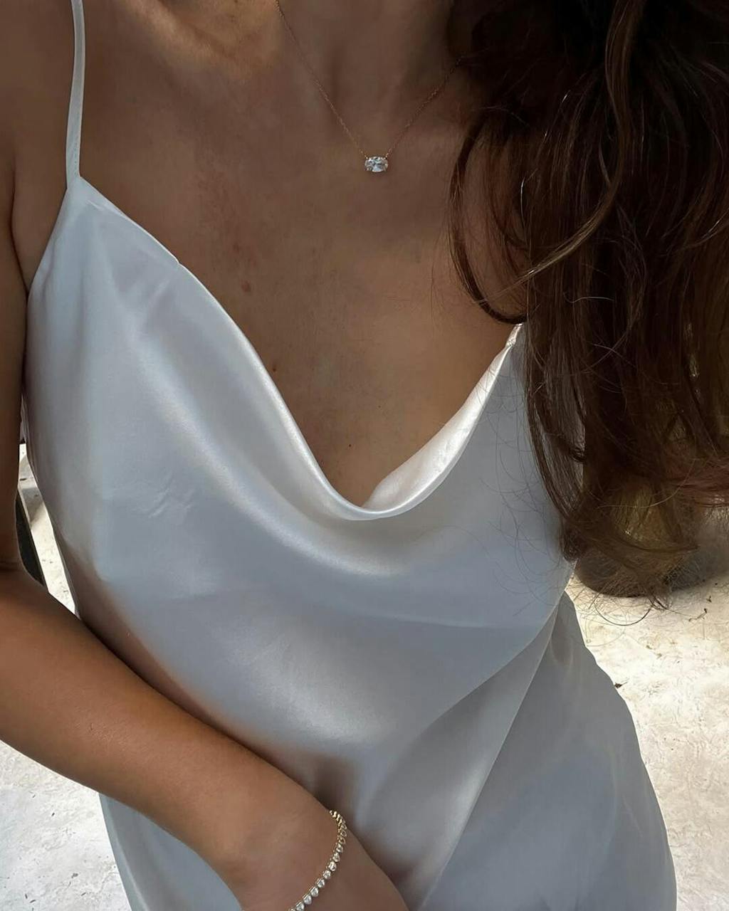 Pure timeless beauty this silk long dress radiates. Love the cowl-neck with sweetheart style top and had to tie-off the straps.